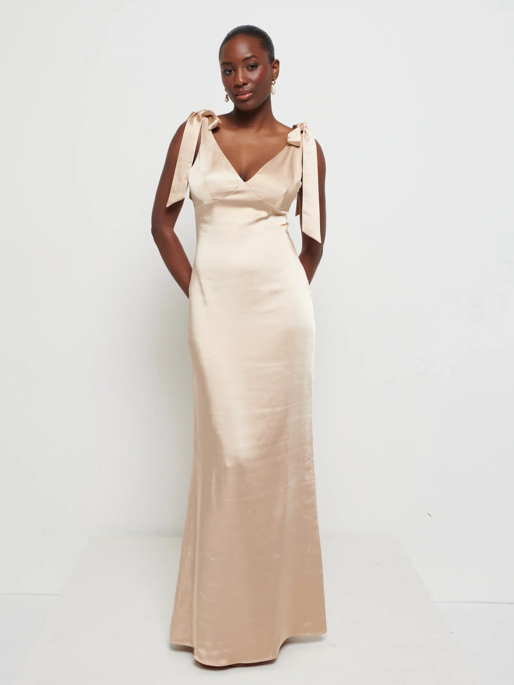 Bridesmaid dresses with bows add a charming, romantic detail that feels both playful and elegant. Whether softly tied at the shoulder, waist, or back, bows bring a touch of femininity and visual interest without overwhelming the design. Perfect for creating a polished yet joyful bridal party look, bow details work beautifully in flowing fabrics and lend themselves well to both classic and modern wedding styles.