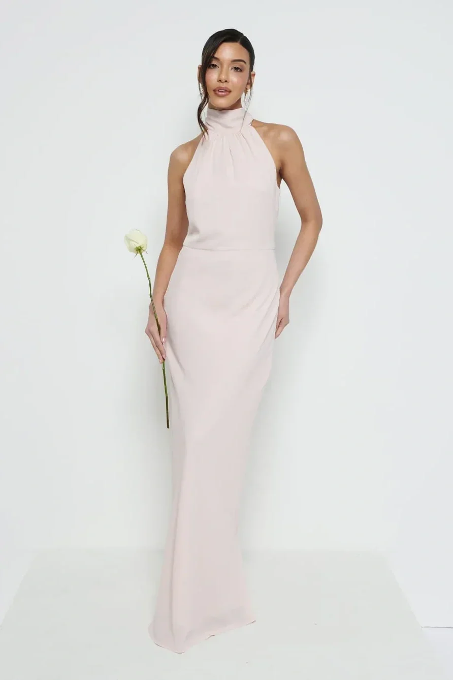 Halterneck bridesmaid dresses offer a timeless yet stylish look, highlighting the shoulders and neckline for an effortlessly elegant silhouette. Known for their flattering shape, halterneck styles create a balanced, elongated appearance and suit a wide range of body types. Whether crafted in flowing chiffon for a romantic feel or sleek satin for a more modern finish, halterneck dresses are a versatile choice that works beautifully for both formal and relaxed wedding settings.