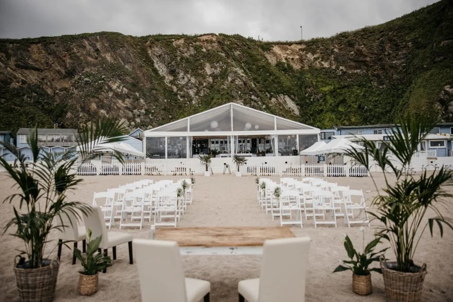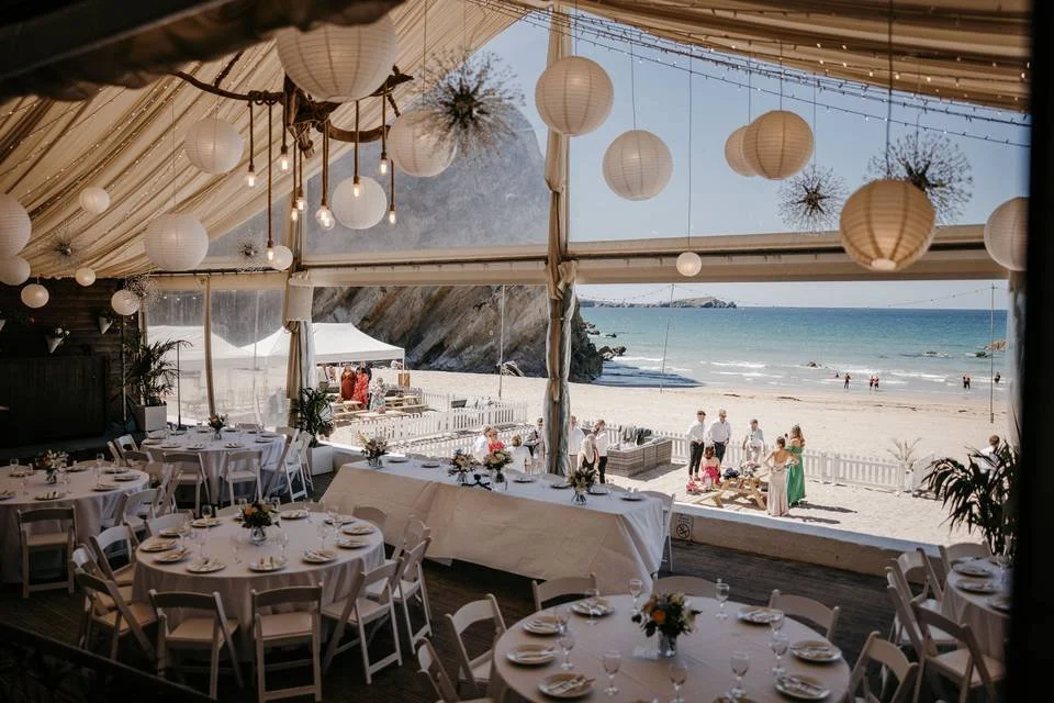 Weddings at Lusty Glaze Beach in Cornwall offer couples the chance to celebrate in a truly unique coastal setting on a private cove just outside Newquay. Nestled between dramatic cliffs and accessible by a staircase carved into the rock, the venue provides an intimate beach backdrop where ceremonies can take place directly on the sand or on the clifftop terrace overlooking the Atlantic Ocean. Receptions are typically held in the relaxed beachside restaurant and bar, where floor-to-ceiling windows frame the sea views and locally sourced Cornish cuisine is served. With exclusive use of the cove, spectacular sunsets over the water, and the sound of waves as a natural soundtrack, Lusty Glaze offers a laid-back yet luxurious destination style wedding experience on the Cornish coast.